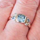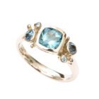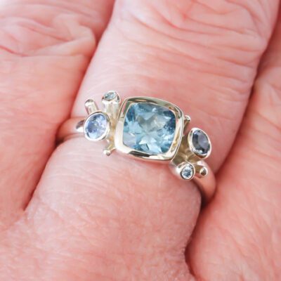 Celebrating memories of sunlit turquoise seas, this ring features an upliftingly bright cushion cut Swiss Topaz, nonchalantly nestled amongst Aquamarine and Blue Diamonds. The cushion shaped Topaz measures 6mm and is angled ever so slightly, to enhance the rotational symmetry of the outer gems and detailing.