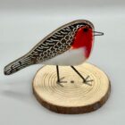 Stand-alone robin in fused glass with natural wood-slice base. The legs, feet and beak are made of stainless wire, and the back and wings are enamel with sgraffito to highlight the feathers