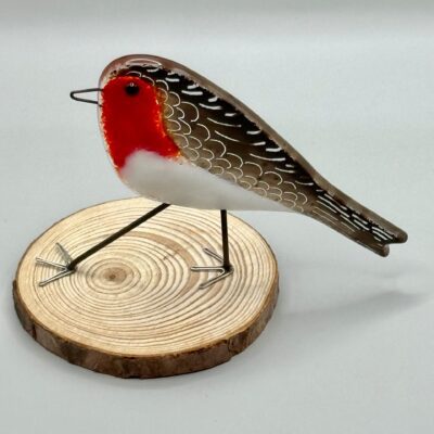 Stand-alone robin in fused glass with natural wood-slice base. The legs, feet and beak are made of stainless wire, and the back and wings are enamel with sgraffito to highlight the feathers