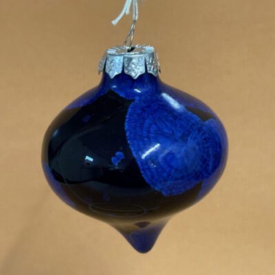 Lightweight porcelain Christmas tree drop shaped ornament glazed in blue on black crystalline