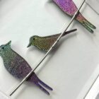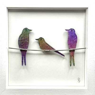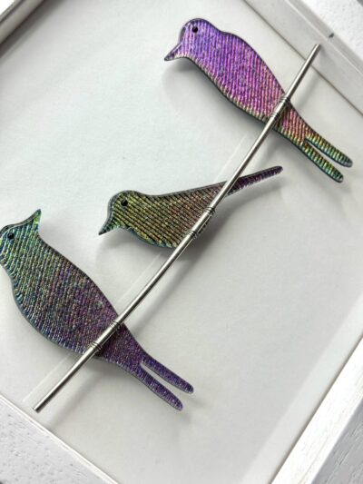 Three fused glass swallows on a wire, against a white background. Hand-made using purple/green faintly striped dichroic (metallic finish) fused glass sheet that subtly changes shade as you move your head around, with the birds’ perch – and talons – hand-formed from stainless wire. Frame size 230mm x 230mm x 32mm; glass size 190mm x 190mm.