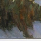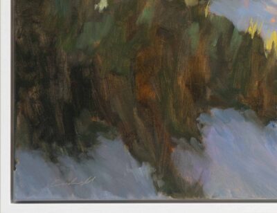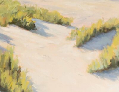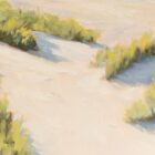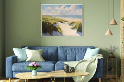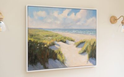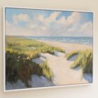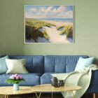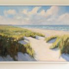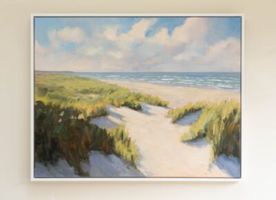 A large statement oil painting of glowing evening light over the north Norfolk coastline. A pathway through the sand dunes bathed in golden light leads you through to the open beach and beyond. This painting is framed in a white floating frame and ready to hang on the wall.