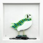 Puffin artwork; the puffin has a green/blue striped back with matching colour on its beak, and is standing on glass rocks with a white background. Hand-made using fused glass sheet with enamel and glass