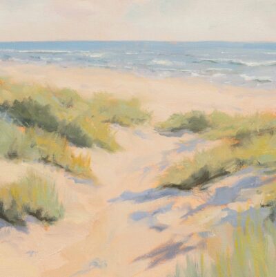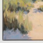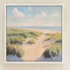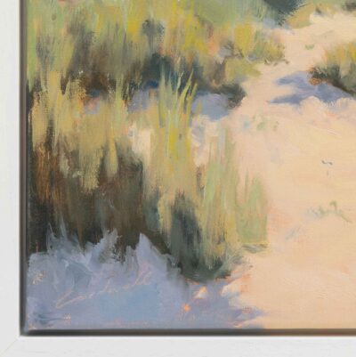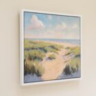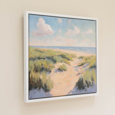 Original oil painting on canvas of a pathway in the sand leading through to the sea. This painting has rich texture and is framed in a white floating frame as shown in the images and ready to hang on the wall.