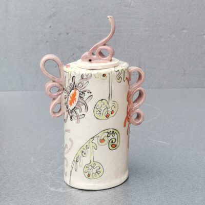 Stoneware jar with hand-painted design by Kathleen Hepworth