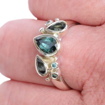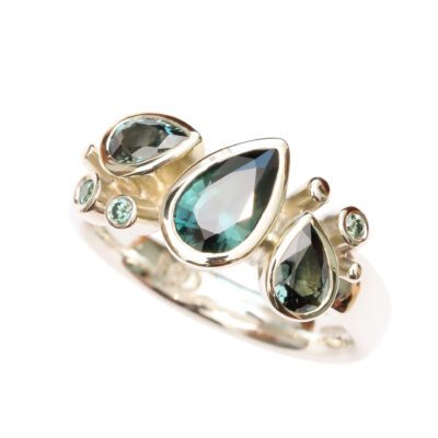 This subtly asymmetric design features 2.25cts of beautiful Teal Green pear shaped Sapphires. The trio of gems create a watery ‘splash’ which can be worn either way up to accentuate the design.