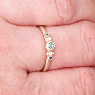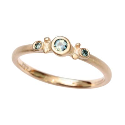 The Sapphire is framed by a pair of 1.7mm diameter Teal Diamonds, mounted on a narrow 2mm wide ‘court’ profile band, lending a delicate, yet very wearable air to this understated ring.