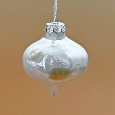 Lightweight porcelain Christmas tree drop shaped ornament glazed in white iridescent crystalline