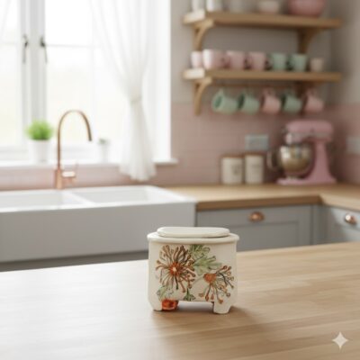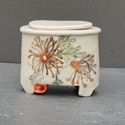 Stoneware keepsake pot with hand-painted design by Kathleen Hepworth